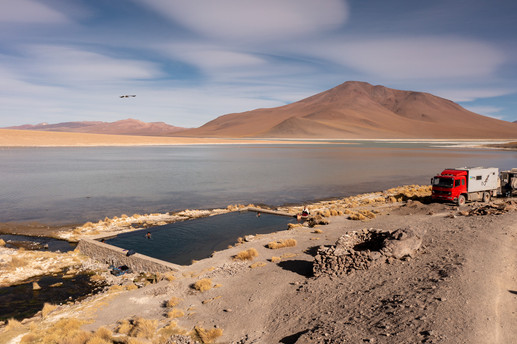We stopped every so often to admire the flamingos, the landscapes, rocks with strange shapes and the intensely blue sky. After a few days we stumbled on a hot spring, someone was building an endless pool in the middle of nowhere just above a lake and we made it our home for two nights. The first night we spent in the pool until early morning, watching the flamingos unfreeze from the frozen lake as the sun started to warm them - what a spectacle.